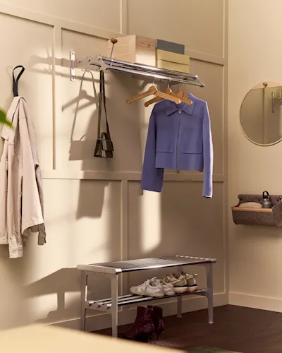 The hat rack Nostalgi 291 was designed in the 40’s. It became an appreciated alternative to the classic precursor, Nostalgi, after having received feedback from clients expressing a want for a hat rack with more depth and extra space for hangers. Some eighty years later the hat rack 291 is once again put into production. This time with an improved design. The hat rack works well together with the Nostalgi shoe rack and is perfect for those looking for a spacious rack with an extra bar for hangers but still wants a simple and classic design.