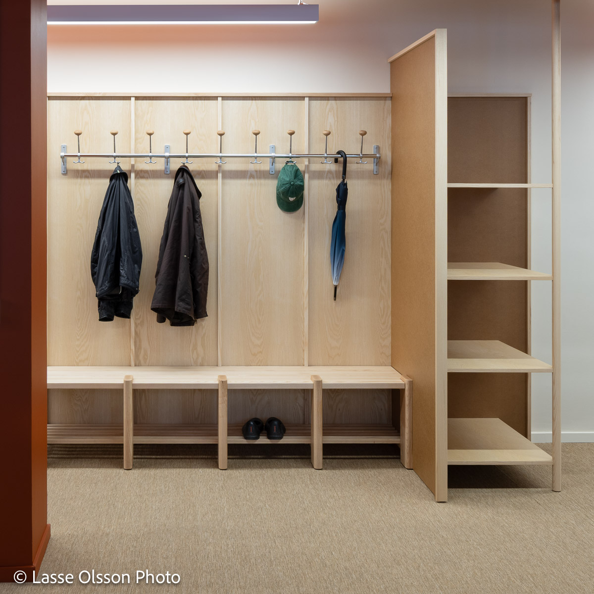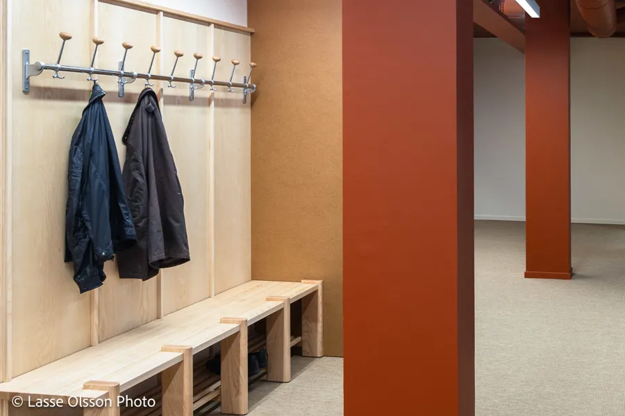 In den Bürobereichen kommt die Hakenleiste „Gustav“ zum Einsatz, während die Umkleideräume mit der Hakenleiste „Nostalgi“ ausgestattet wurden. Durch die Verlängerung der Hakenleisten mit Zwischenkonsolen und die Ergänzung durch das Zubehör „Oskar“ entsteht eine flexible und modulare Lösung.