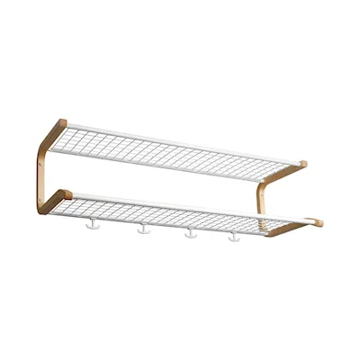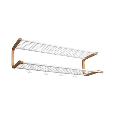 Eine robuste und handwerklich hervorragende Hutablage, die in ihrer Optik an das Modell Classic erinnert, bei der jedoch anstelle von Stahlrohren formgepresstes Holz zum Einsatz kommt: Buche, Birke und Eiche in den Halterungen. Erhältlich als Hutablage und als Schuhregal.