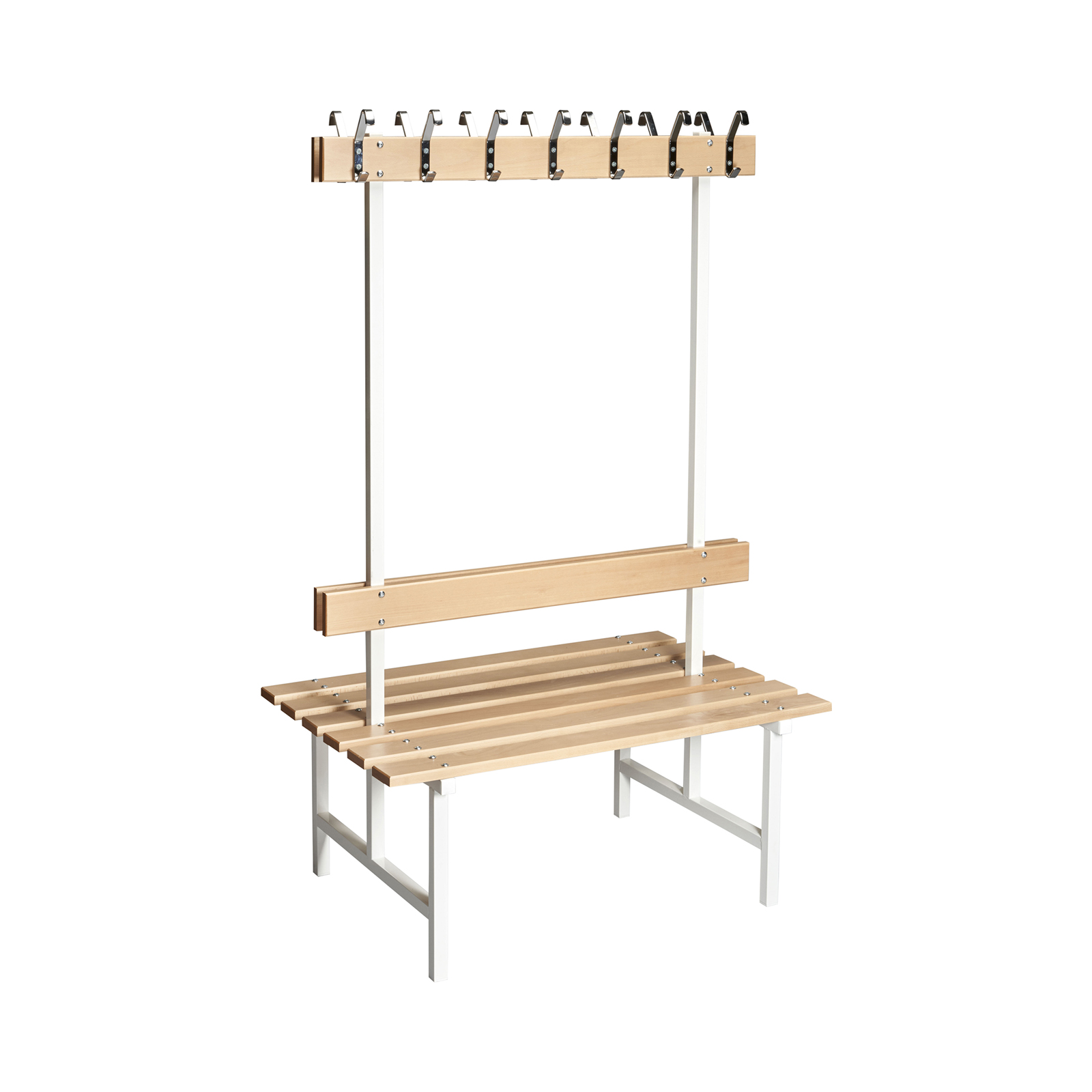 If a normal bench doesn’t really meet your needs, you can choose a double-sided model with both hooks and backrests instead. The double-sided bench is suitable for anyone who needs a seat with multiple functions. Refer to our product information for the different options to choose from. NOTE! The pictures above show how the bench looks in width 1050 mm and 1500 mm.