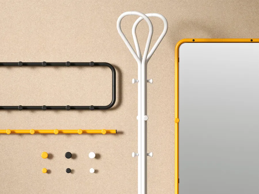 The items launching in 2025 include several categories such as a slender freestanding coat stand with an airy bow-like top, an efficient coat hanger nodding to the 50s hat rack by its shape, a slim minimalist hook strip, and a hallway mirror with extra hooks for a keychain or other essentials. And of course, the wall mounted hooks, available in two sizes. All five new designs in the Classic 2025 range, are produced locally in southern Sweden and available in several colors, lengths and versions.