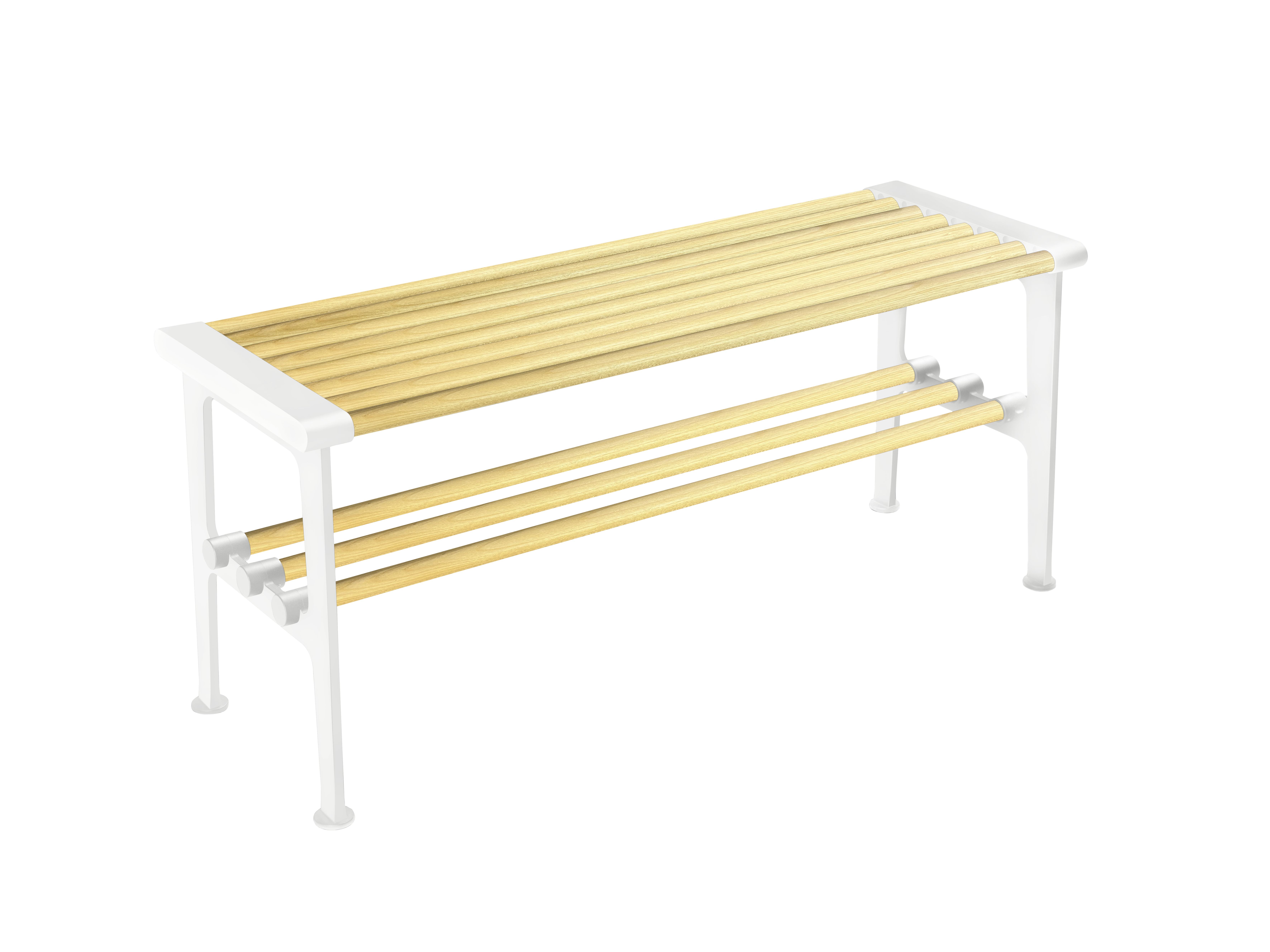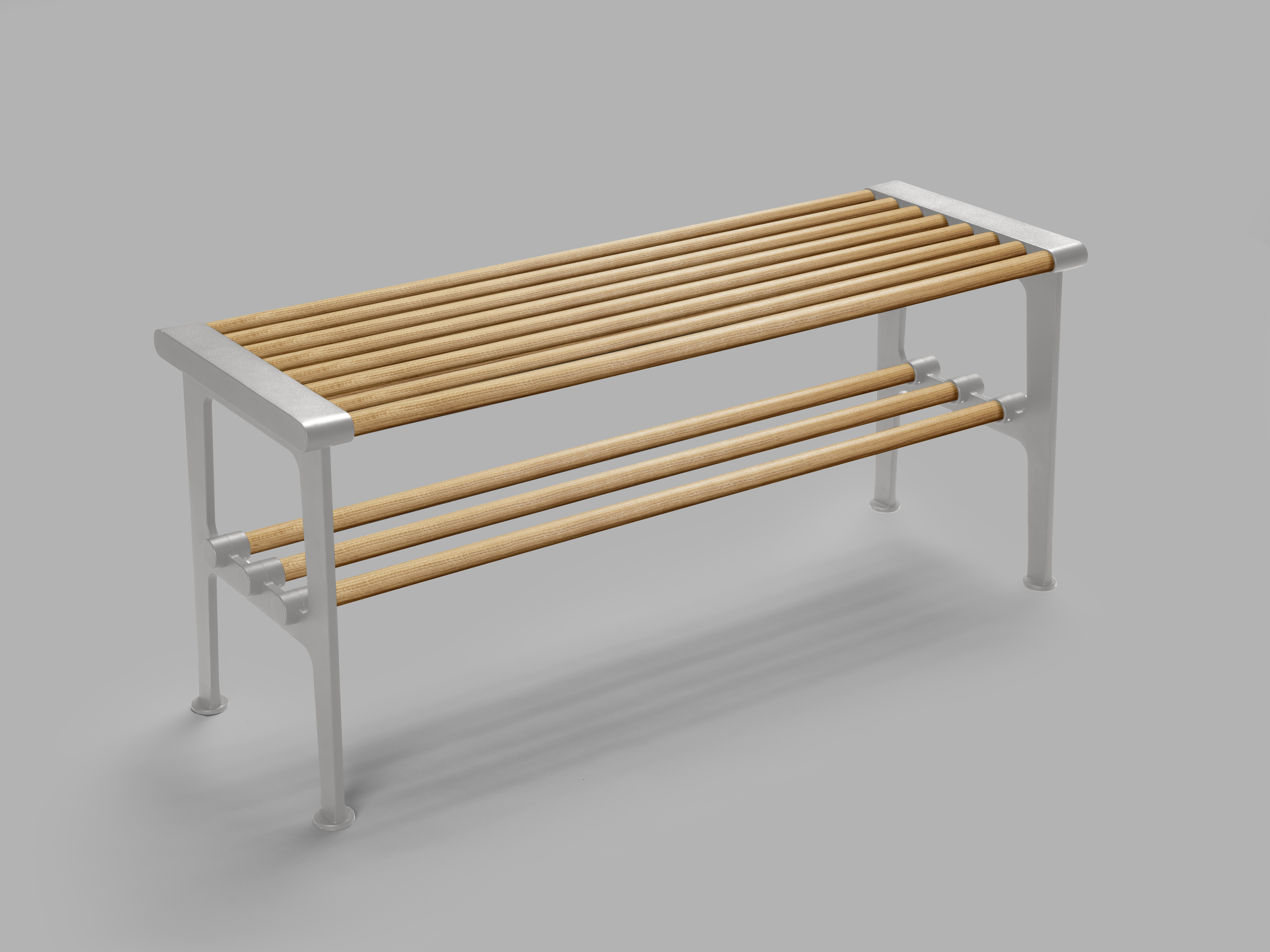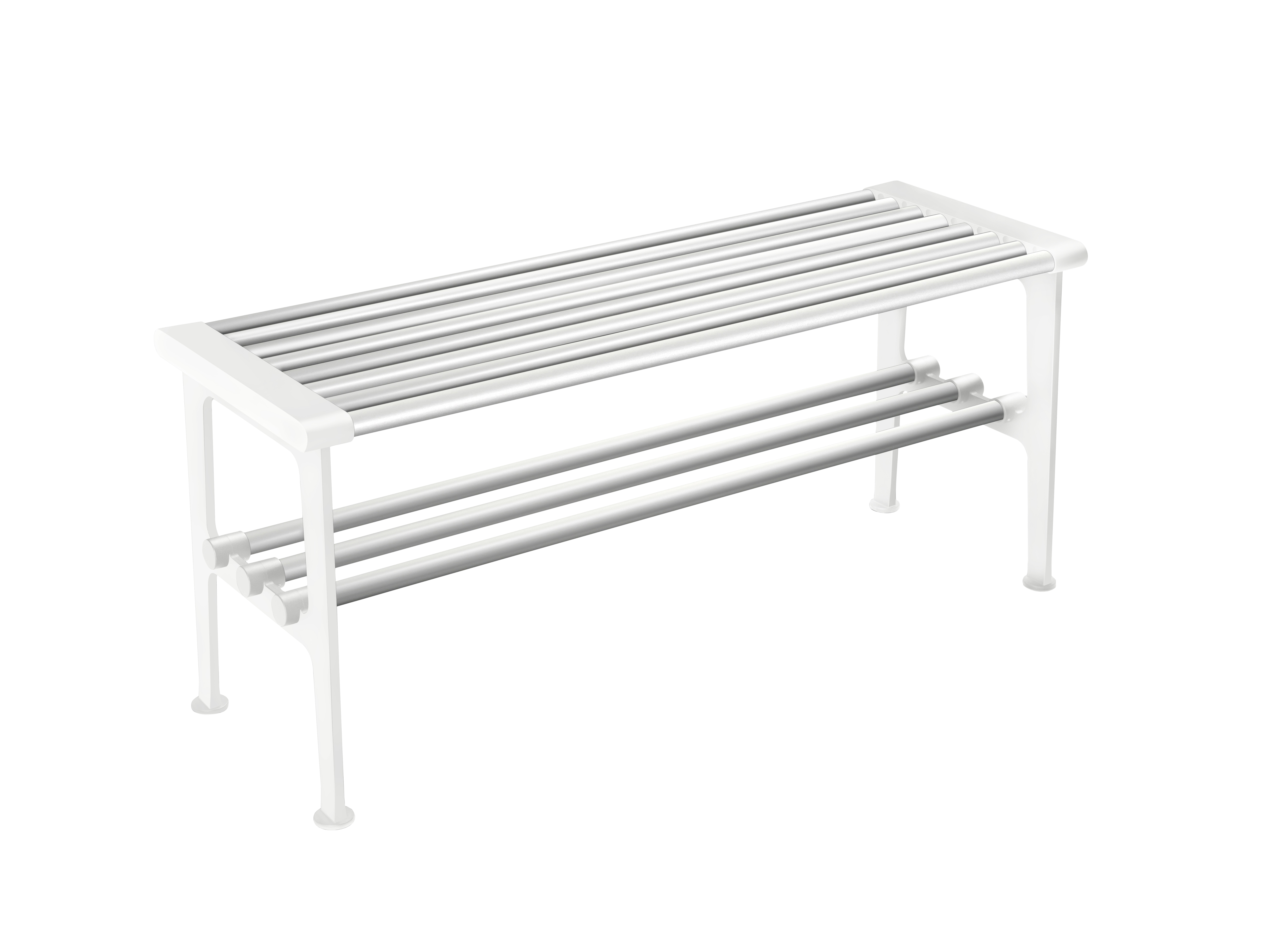It took 87 years for the Nostalgi rack to get a bench in the product family. Even so, the bench seems obvious as an addition to the product family. Inspired by the hat and shoe rack, Roger Persson has designed a flexible and sturdy product that extends indefinitely with the help of middle brackets. But it can also function as a free-standing shoe rack, a seat to tie your shoes on at the entrance, or even a combination of the two. As with the other Nostalgi products, the brackets are made of recycled aluminium, joined by metal or wooden bars.