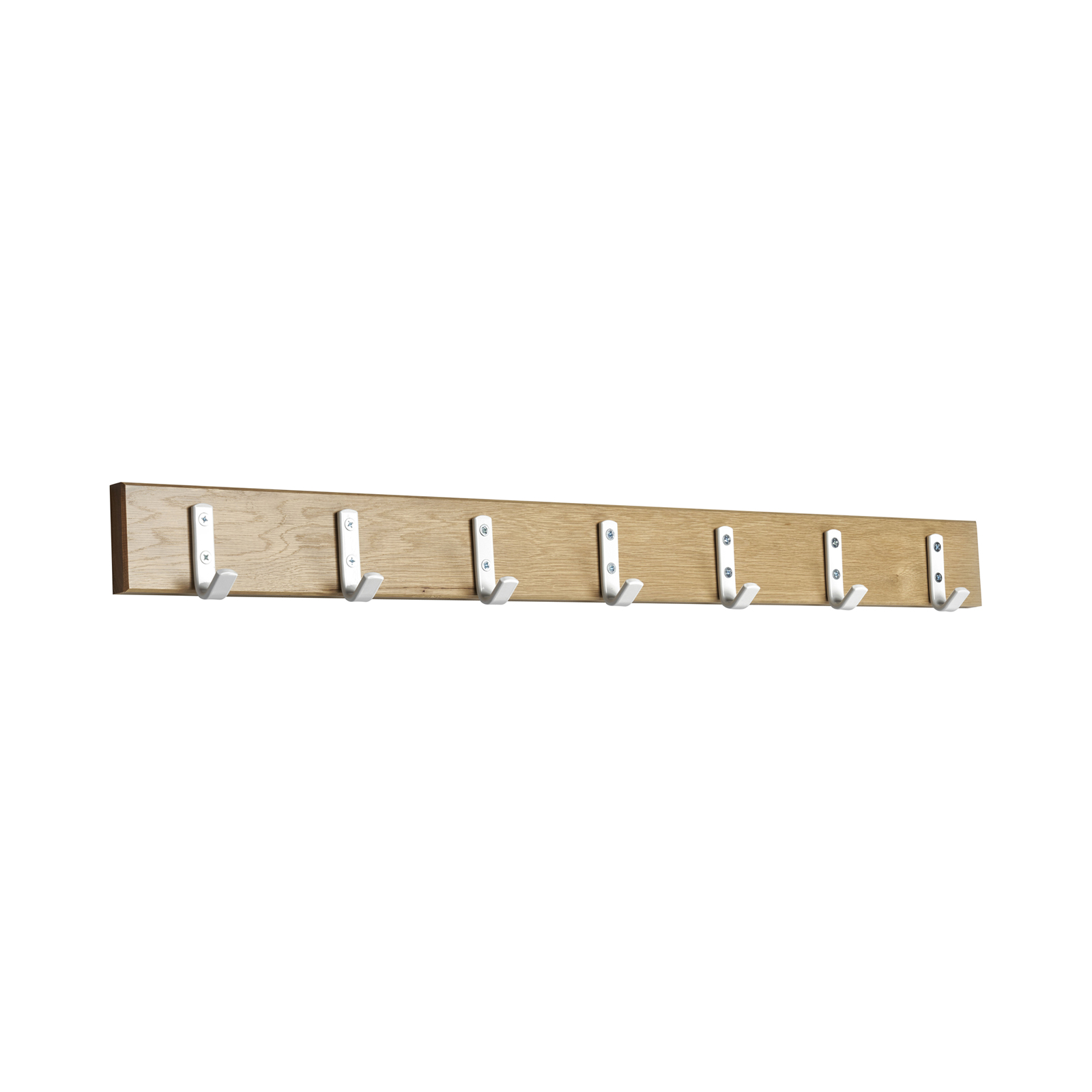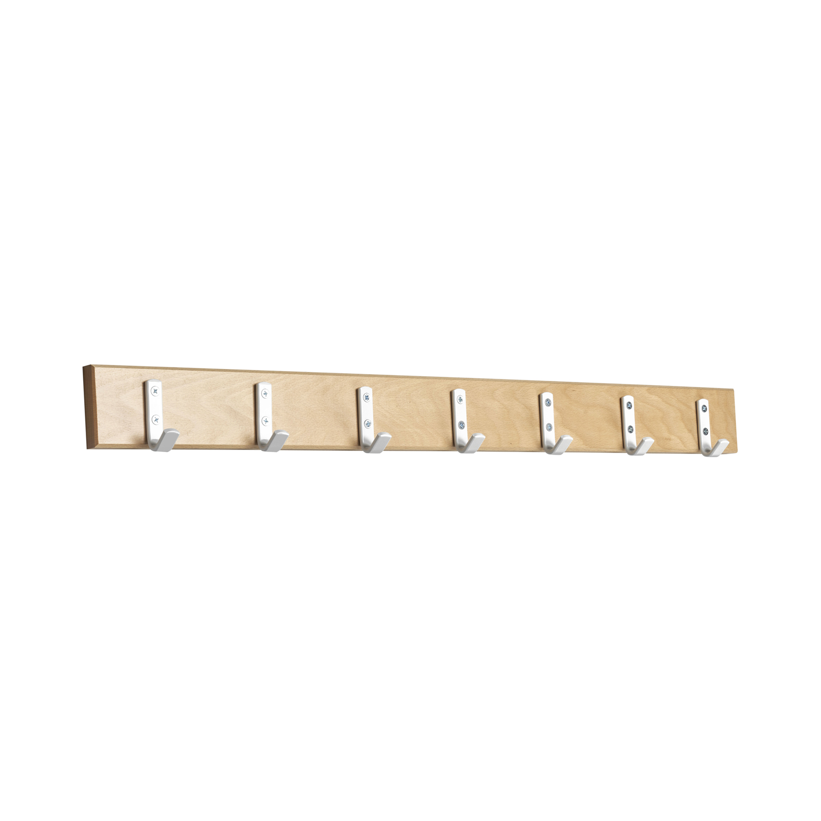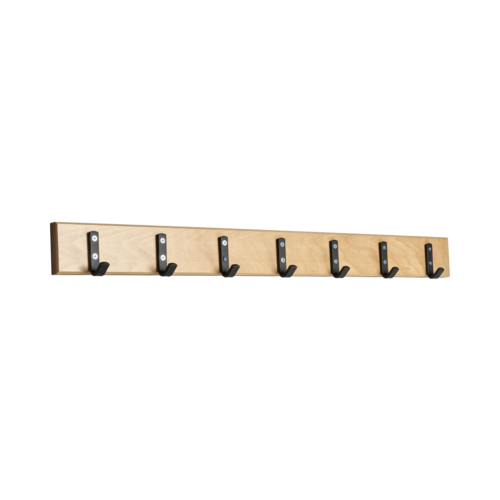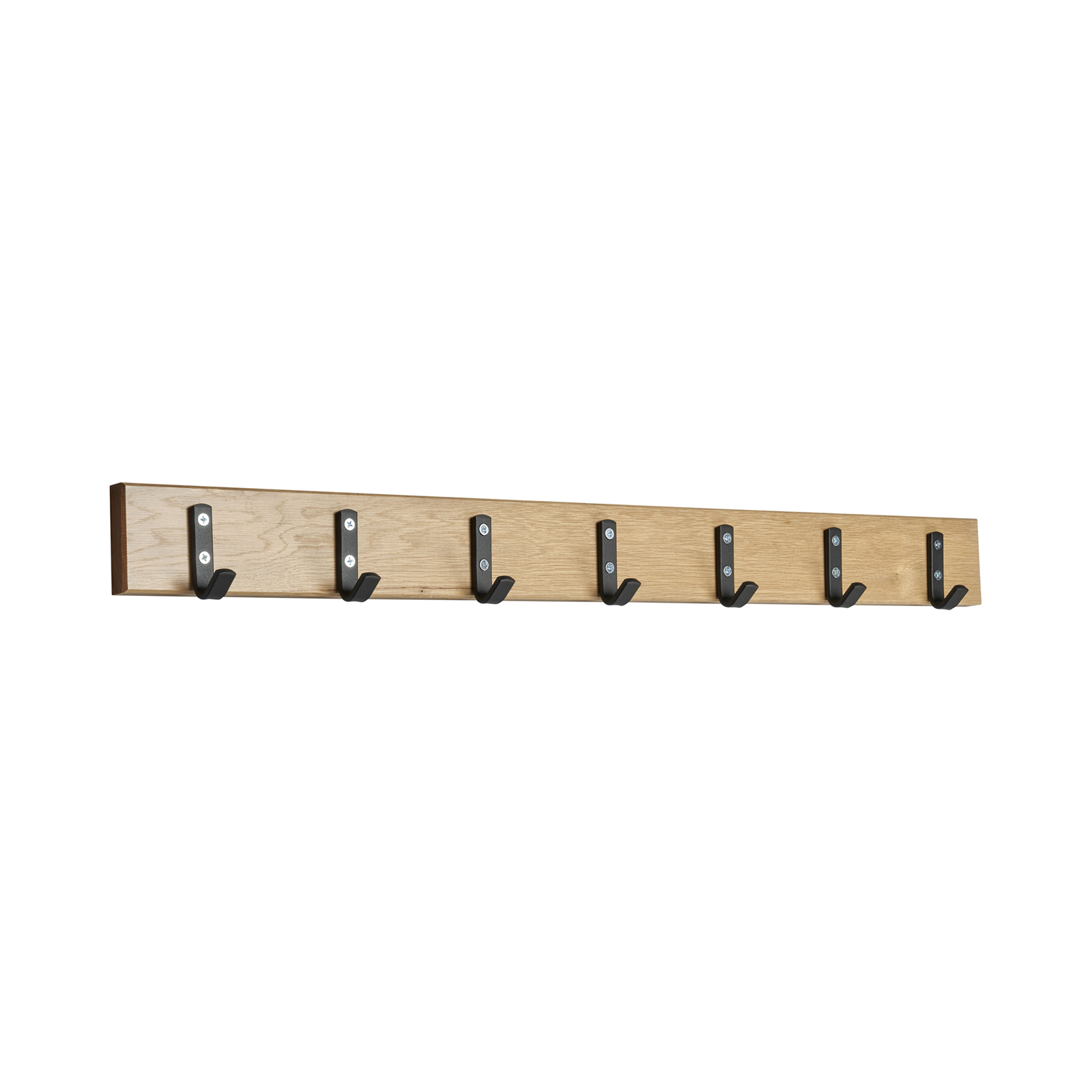 Classic hook strip with ‘school hooks’. Made in lacquered beech, birch, pine or oak and in white painted or black finish. Available in many different lengths, 75 mm in to the first hook and 150 mm c/c between hooks. NOTE! The picture above shows what the hook strip looks like in width 1050 mm. What differs from width to width are the number of hooks.