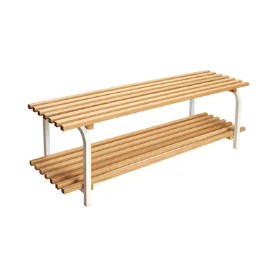 Robust frittstående skohylle med hylleplate av klarlakkerte trelister. Finnes i forskjellige varianter og bredder.