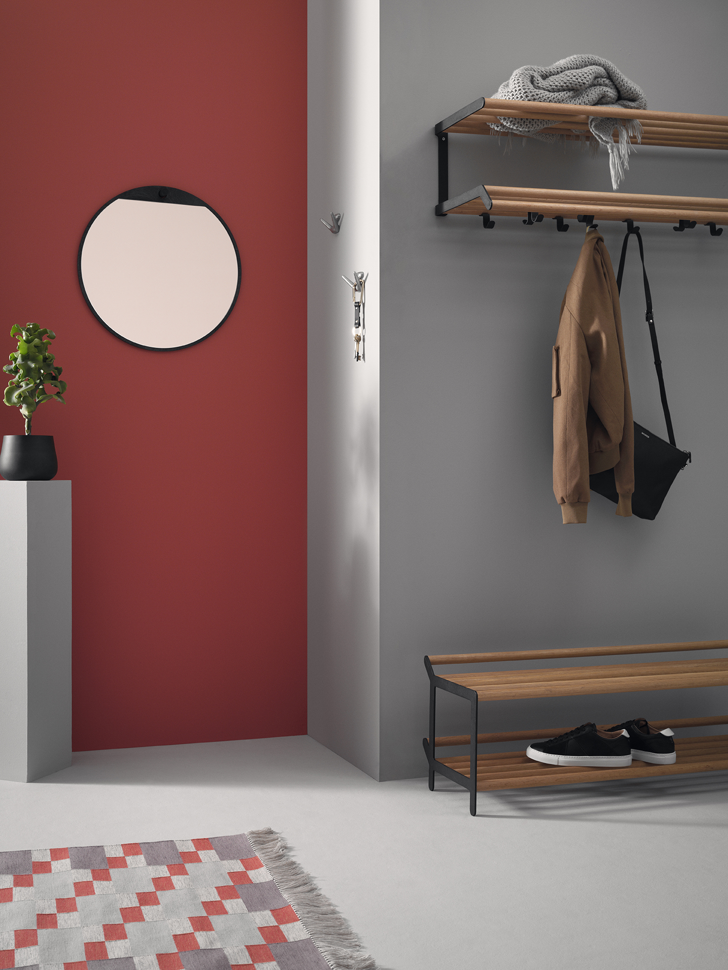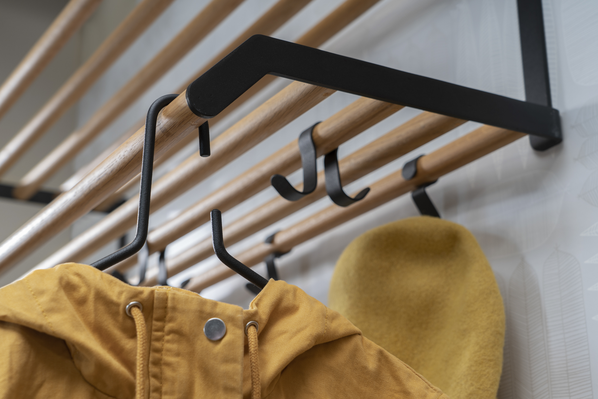 Produktfamilien Tamburin ble til med Andreas Klippinges målsetting om å tegne noe «superfunksjonelt». Valget falt på hattehyllen, viktig for svenske hjem og helt uunnværlig siden skandinavisk klima med årstidenes store vekslinger stiller høye krav til gangens ytelse. Tamburin hattehylle består av pulverlakkerte stålendestykker og knagger kombinert med klarlakkerte rundstaver i eik. Gavelens vinkel avslører Tamburins karakter av egnet enkelhet, konstruksjonens presisjon og materialenes høye kvalitet. Tross dens nette ytre er gangmøbelserien Tamburin robust. Hattehyllen i bredde 1000 mm omfatter 4 enkeltknagger og 3 dobbeltknagger och bredde 600 mm omfatter 3 enkeltknagger og 2 dobbeltknagger. En romslig og funksjonell hattehylle som leveres montert. Bildet over viser hvordan hattehyllen ser ut i bredden 1000 mm. Det som skiller seg fra bredde til bredde, er antall kroker.