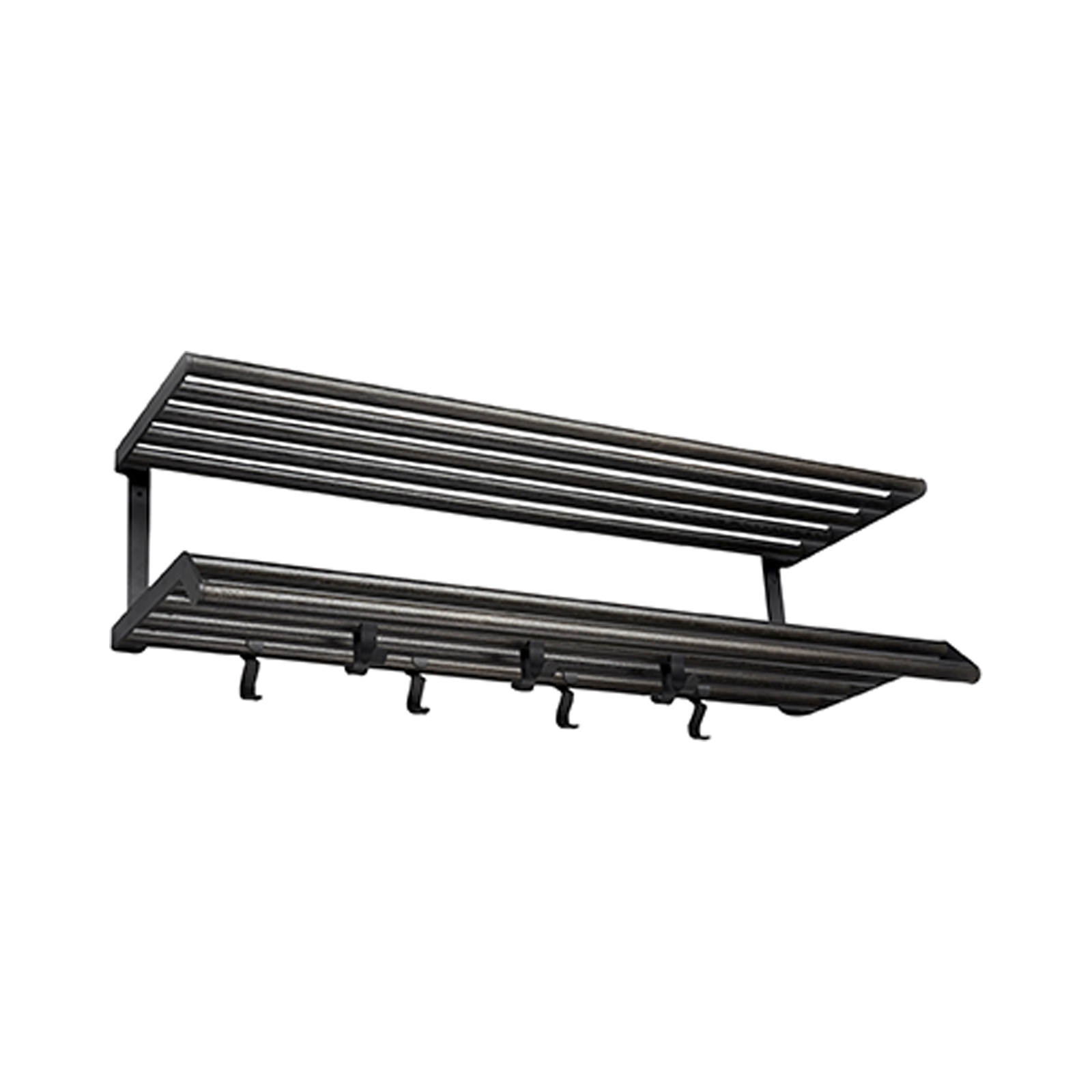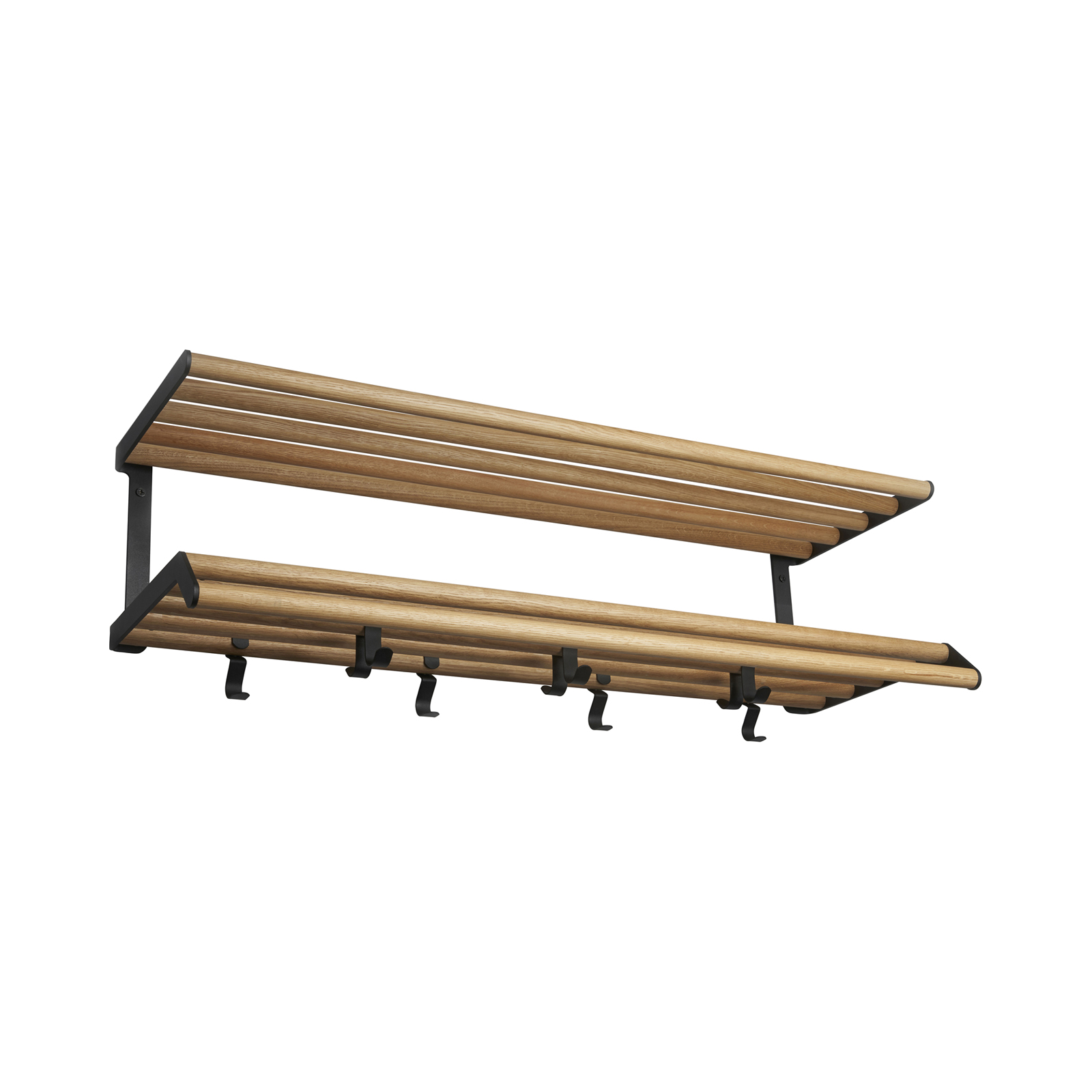 Bildet over viser hvordan hattehyllen ser ut i bredden 1000 mm. Det som skiller seg fra bredde til bredde, er antall kroker.