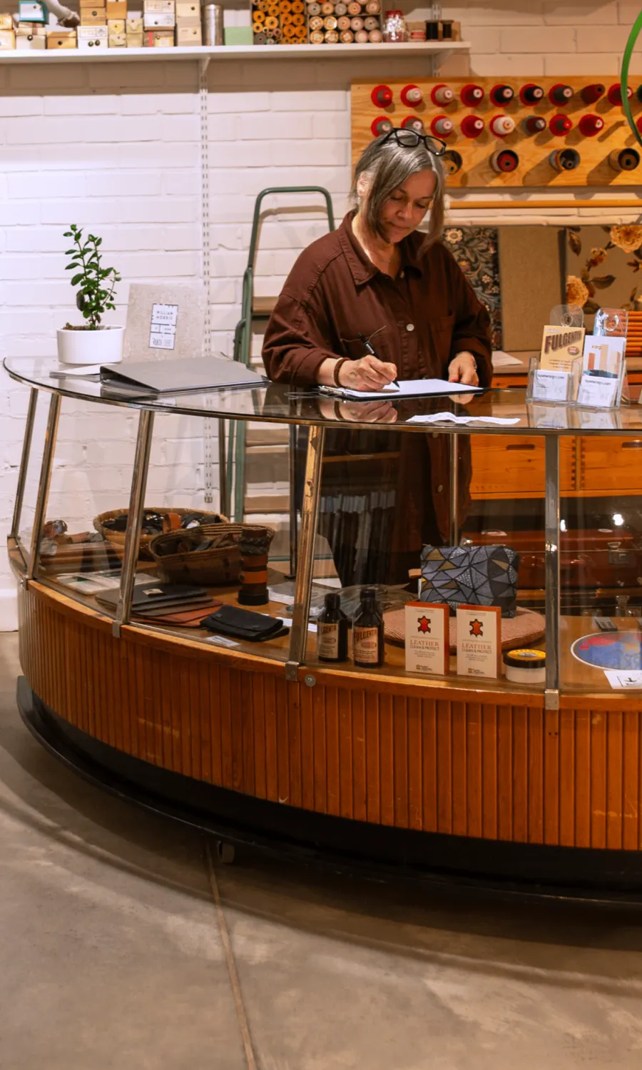 I Monteringshallen sitter vi under samma tak som andra hantverkare vilket skapar en inbjudande, lugn och kreativ atmosfär — en kontrast mot det övriga köpcentrumet. Vi har en butiksdel och en verkstadsdel, där vi valt att inreda så att butik och verkstad hänger ihop, det gör att man kan se in i verkstaden där vi står och jobbar med möblerna. I princip all vår inredning är återbruk vilket ger en hemtrevlig känsla. Även fast vi har relativt stora lokaler har vi både material och möbler som är skrymmande och kräver att vi använder smarta förvaringslösningar. Till exempel krokar och hyllor från Essem.