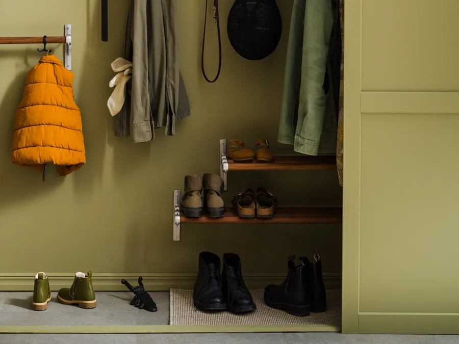 Hyllor, krokar och förvaring anpassade för att göra en snygg entré