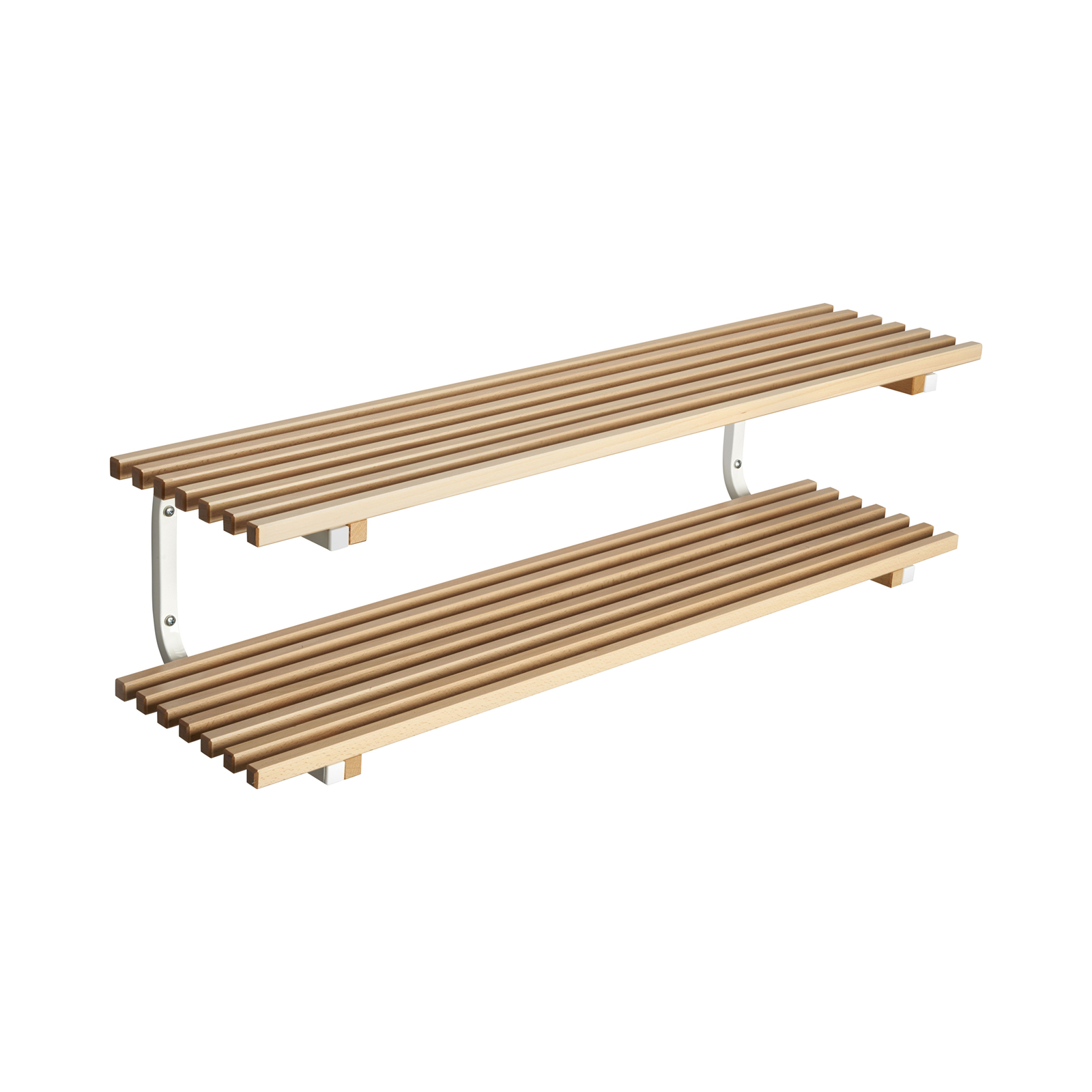 Robust skohylla med hyllplan av klarlackerade träribbor. Finns både som fristående och vägghängd variant i olika bredder.
