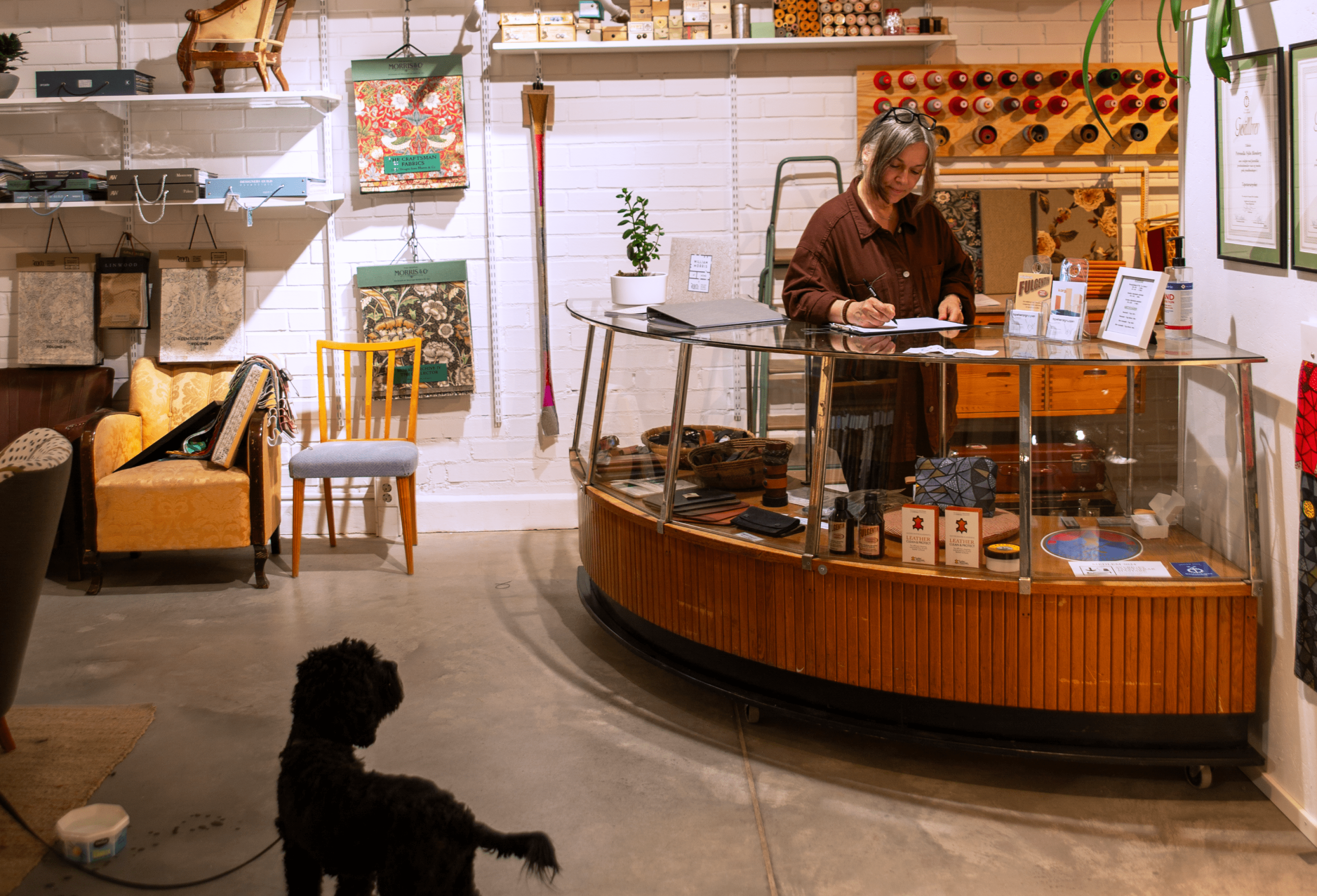 When we arrive the charming workshop dog Rudi rushes towards us. Soon after, we are greeted by a creative craft environment where the sewing machine is in full swing wrinkling a yellow-flowered fabric, air guns roar and tools line the walls. All the tools are hung on specific hooks and nails are neatly sorted into boxes, each thing has its place.