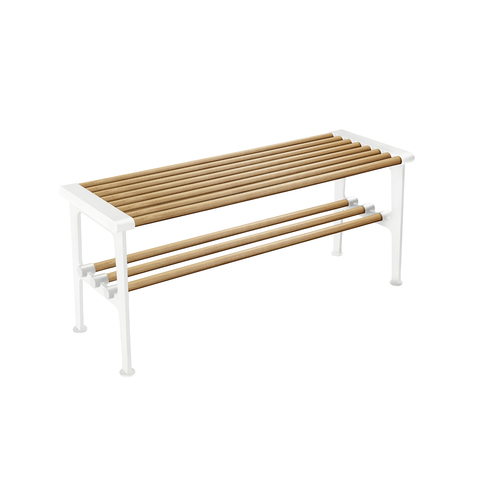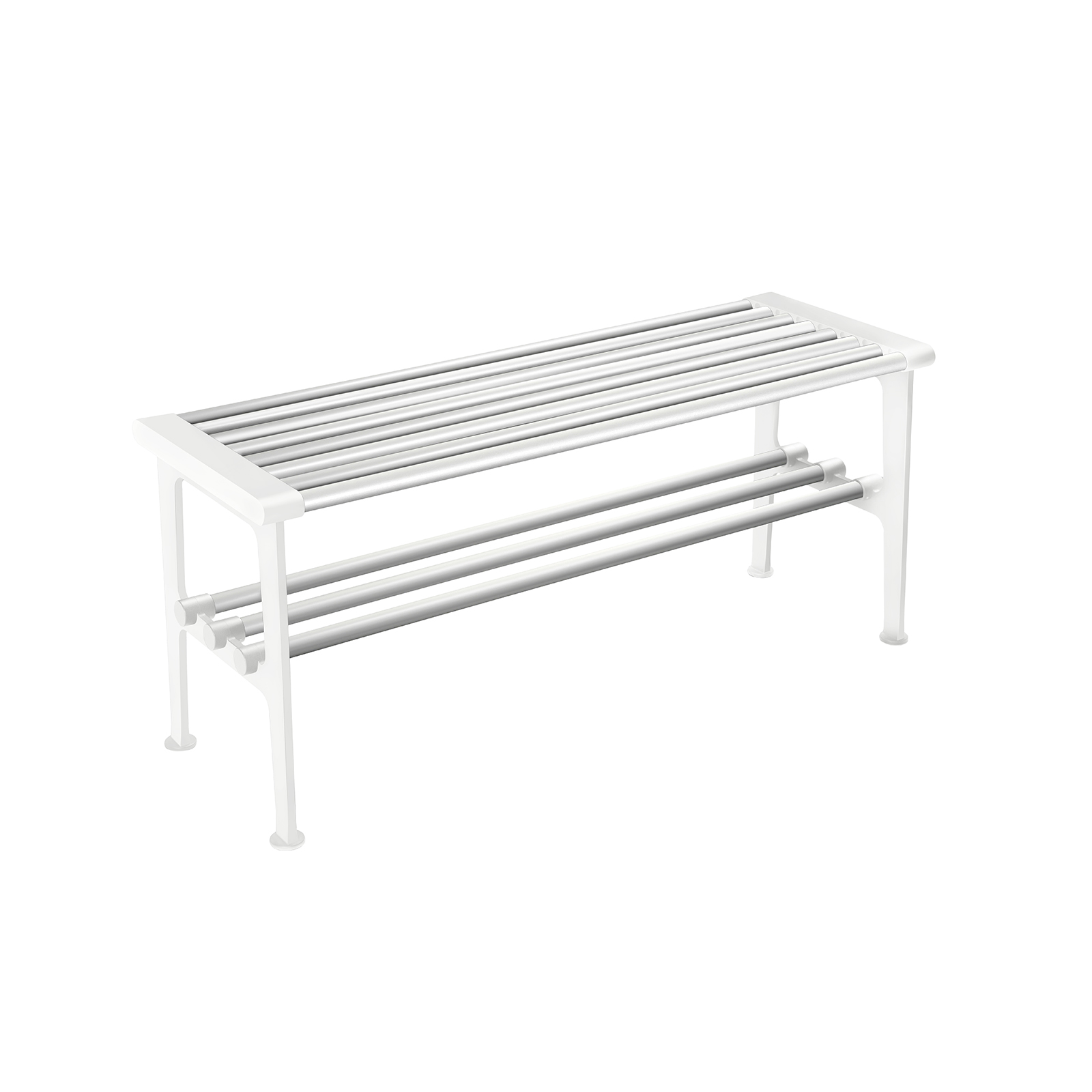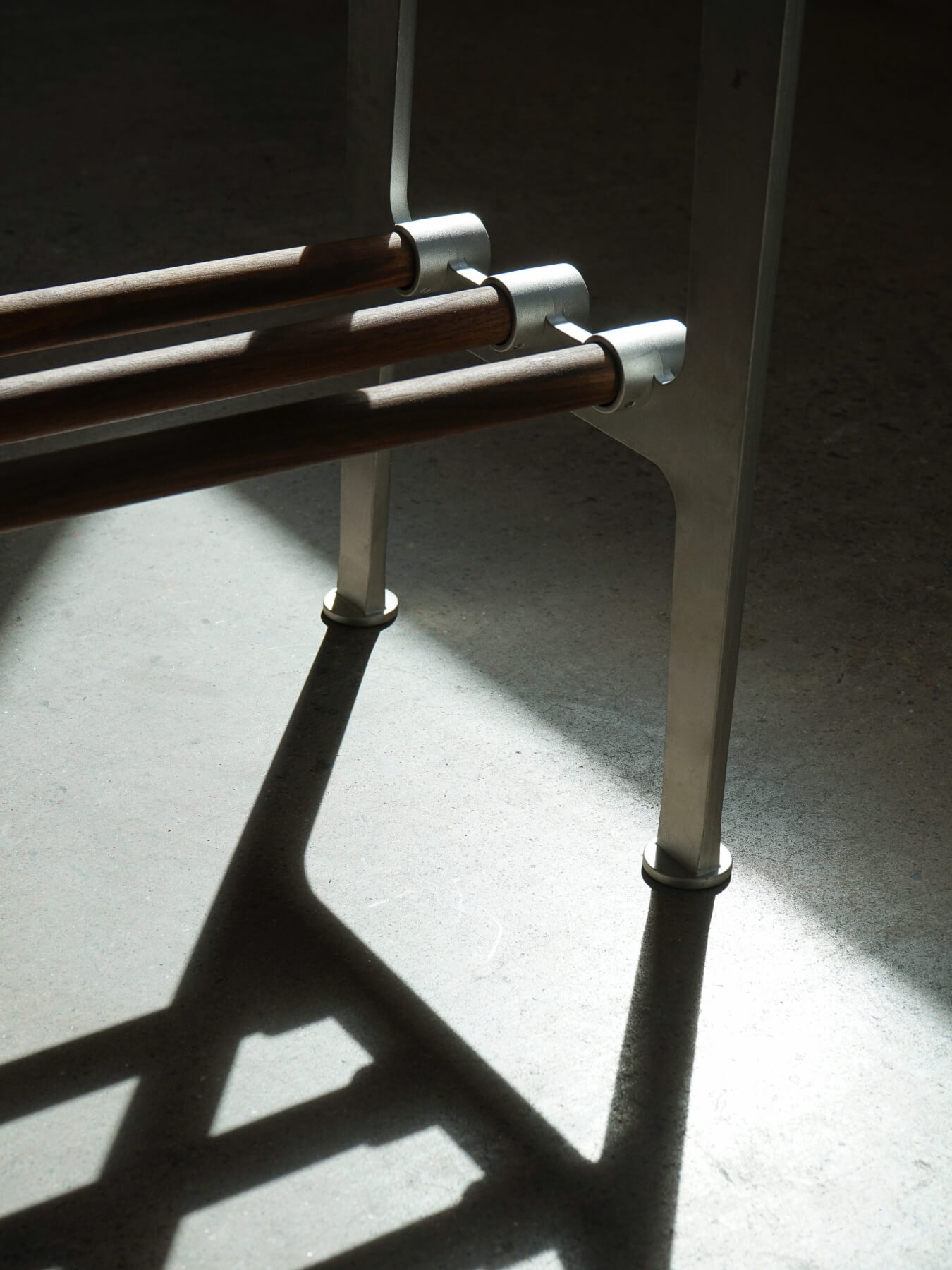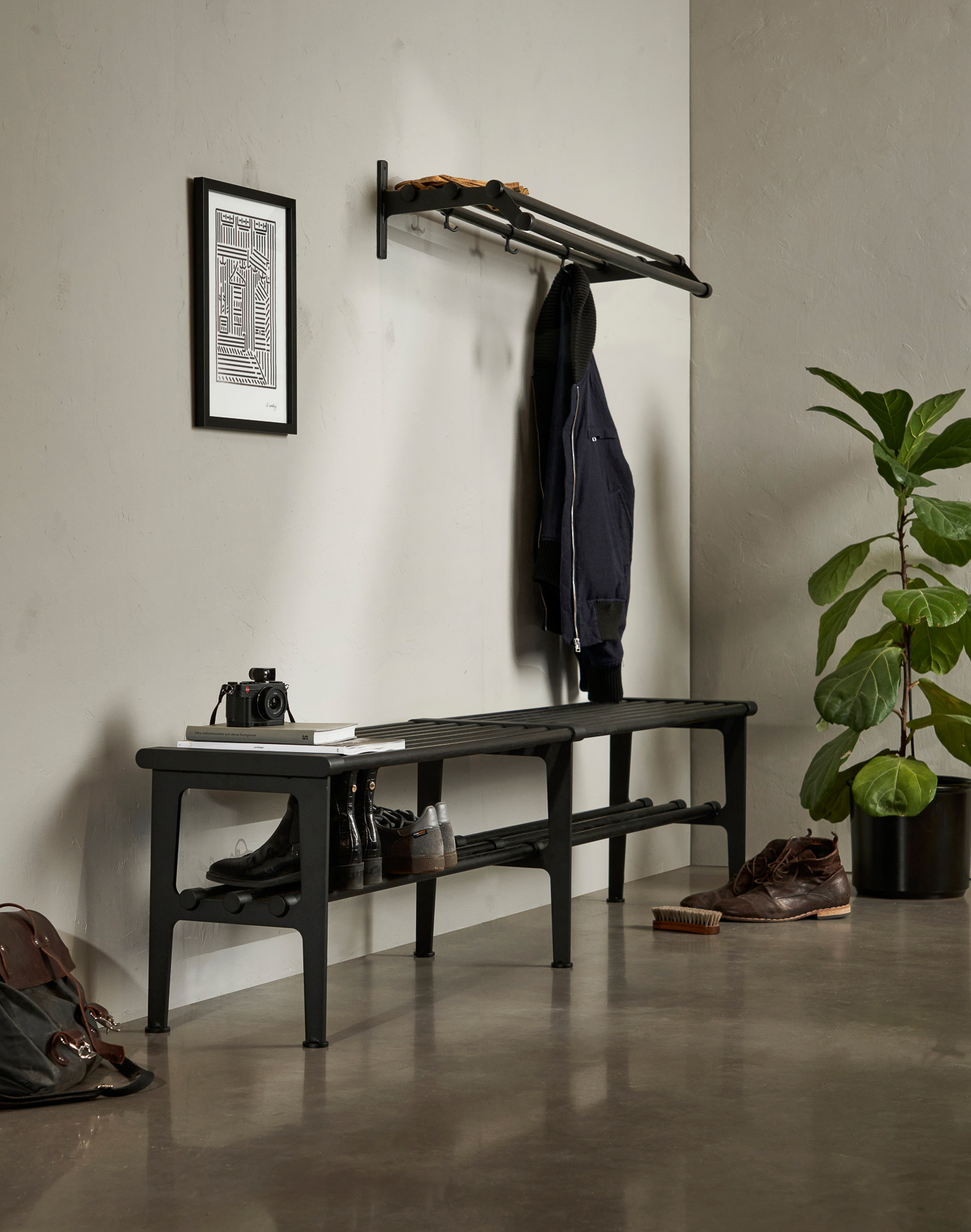 It took 87 years for the Nostalgi rack to get a bench in the product family. Even so, the bench seems obvious as an addition to the product family. Inspired by the hat and shoe rack, Roger Persson has designed a flexible and sturdy product that extends indefinitely with the help of middle brackets. But it can also function as a free-standing shoe rack, a seat to tie your shoes on at the entrance, or even a combination of the two. As with the other Nostalgi products, the brackets are made of recycled aluminium, joined by metal or wooden bars.