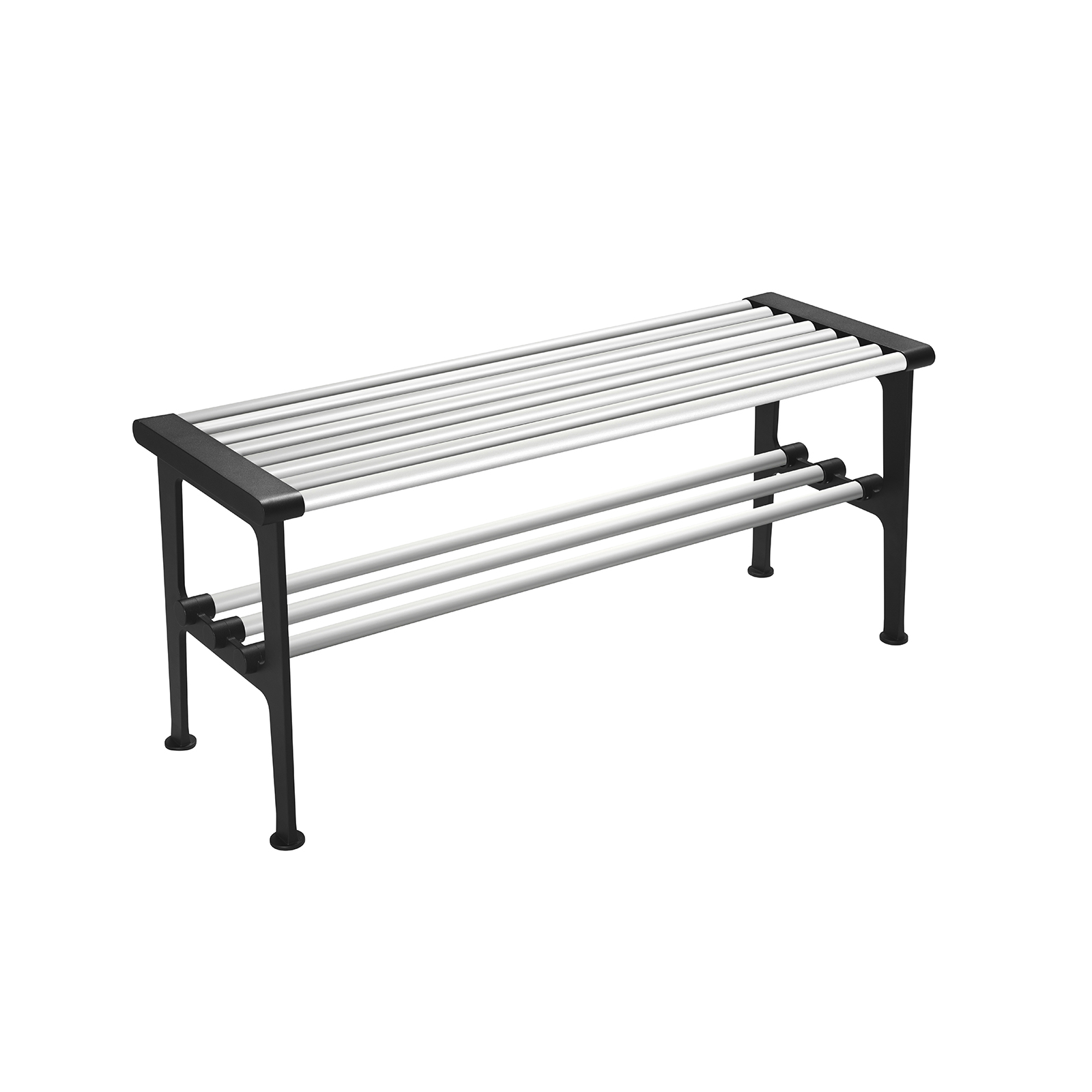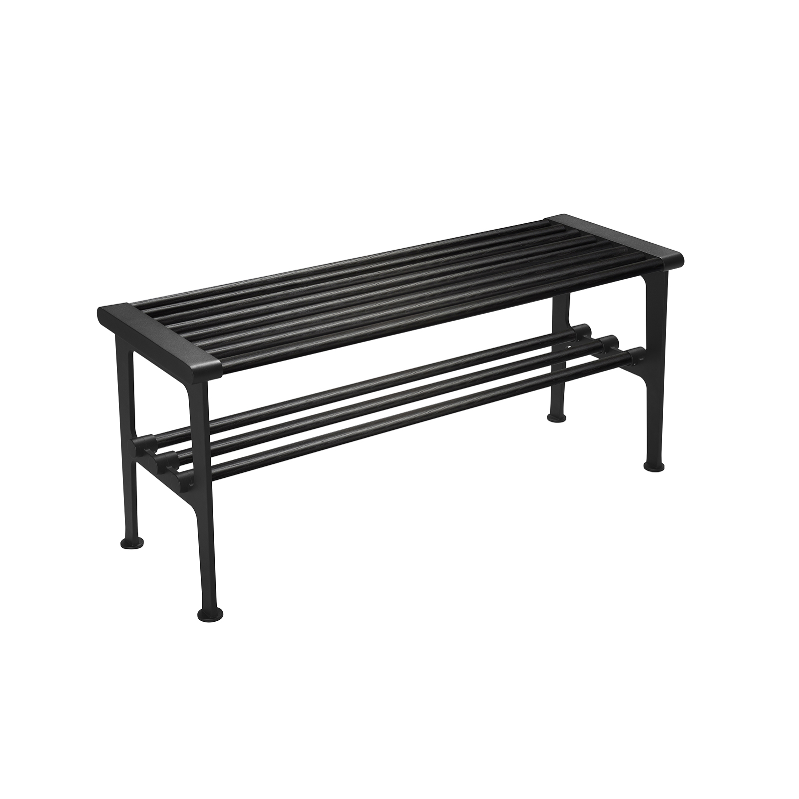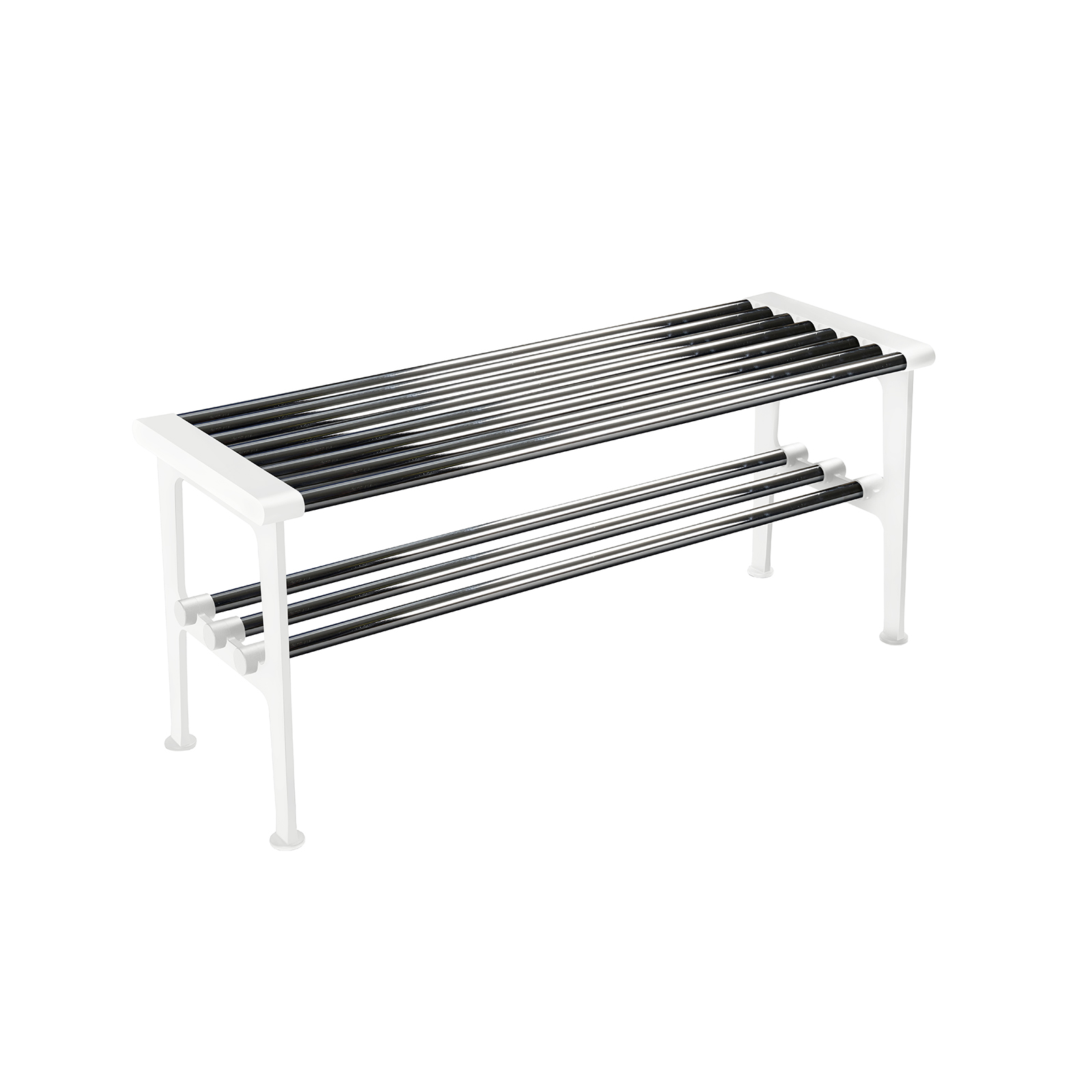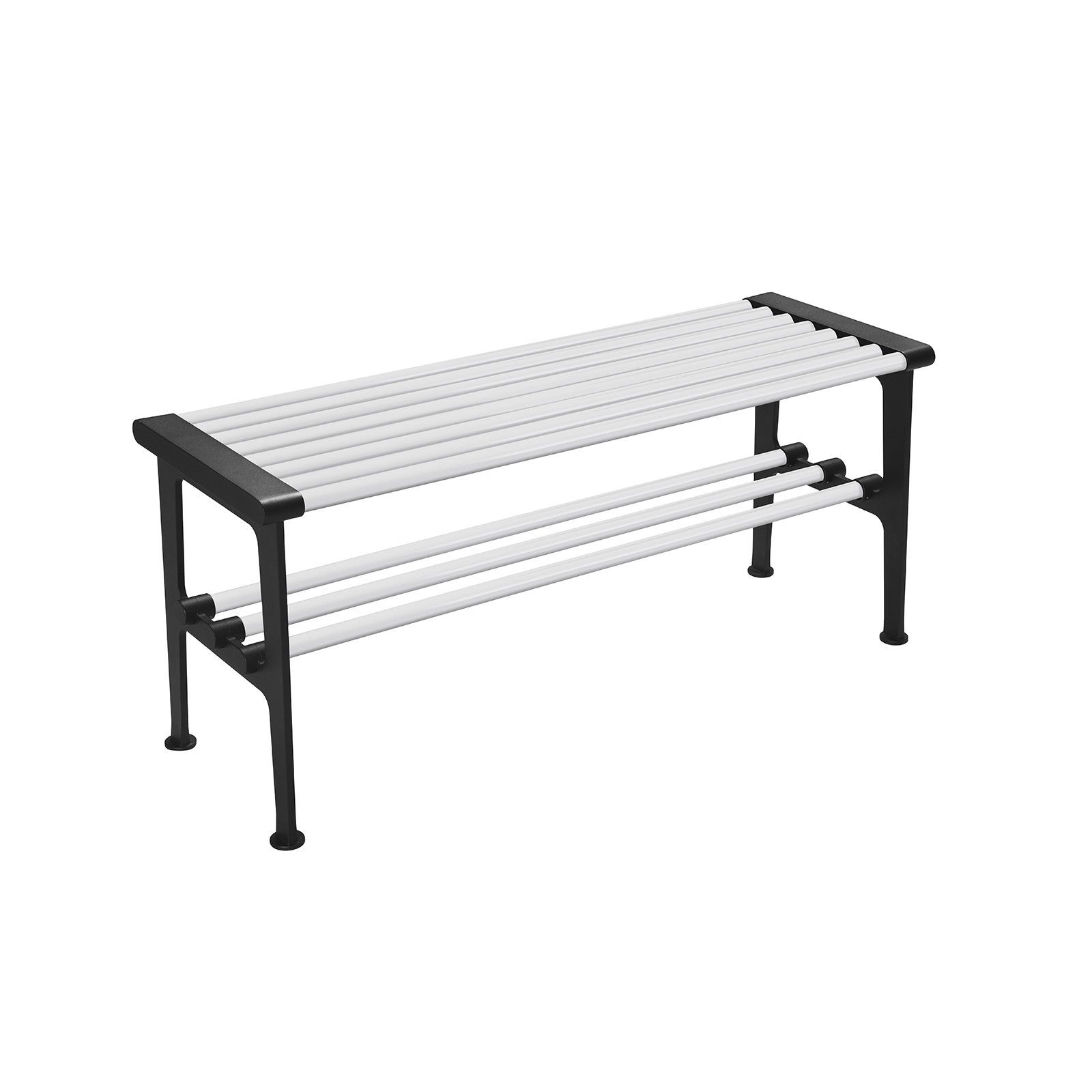 It took 87 years for the Nostalgi rack to get a bench in the product family. Even so, the bench seems obvious as an addition to the product family. Inspired by the hat and shoe rack, Roger Persson has designed a flexible and sturdy product that extends indefinitely with the help of middle brackets. But it can also function as a free-standing shoe rack, a seat to tie your shoes on at the entrance, or even a combination of the two. As with the other Nostalgi products, the brackets are made of recycled aluminium, joined by metal or wooden bars.